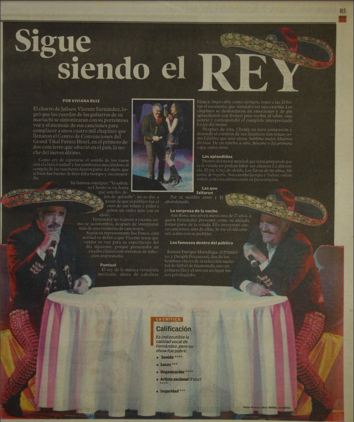 En 2005, Vicente Fernández dejó claro que continuaba siendo “El Rey”. En los dos conciertos que ofreció en marzo de ese año, en el Centro de Convenciones del Gran Tikal Futura Hotel, la escenografía simulaba un bar en el que el Charro de México interpretó éxitos como: Lástima que seas ajena, Sublime mujer, Mujeres divinas, De un rancho a otro, Bésame y La primera copa, entre otras.
