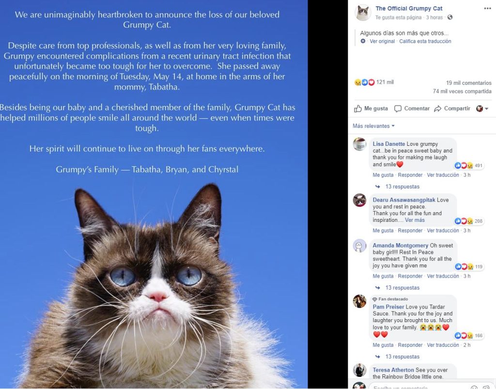 De hecho en Facebook Grumpy tenía su propia página oficial, donde este viernes se conoció la lamentable noticia. Hasta el momento 119 mil personas han reaccionado a ese post en Facebook y más de 19 mil comentarios en los que despiden y recuerdan a la gata. En Twitter tiene más del millón y medio de seguidores.