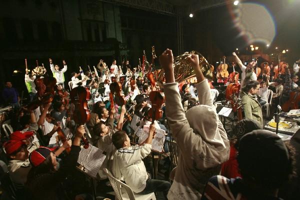 A pesar del frío, los músicos tocaron, saltaron y bailaron con gran energía y animaron a los asistentes con su hip-hop sinfónico.