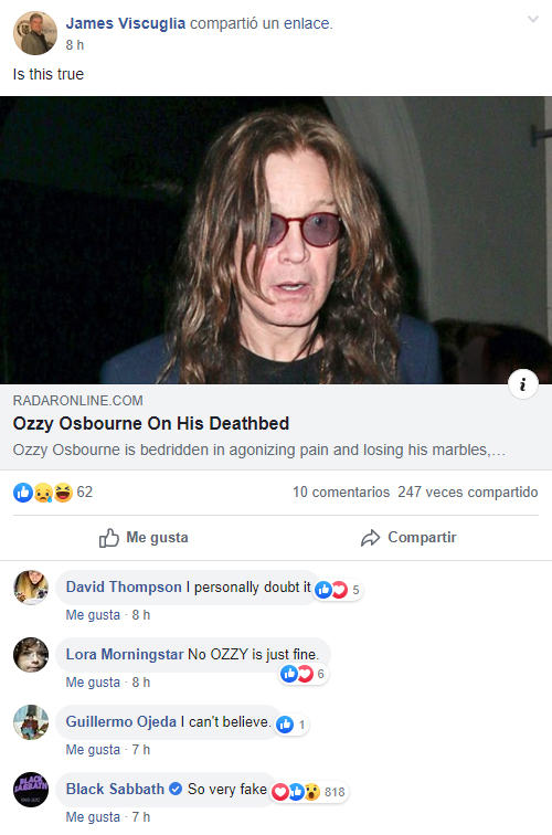 Debido a los múltiples mensajes sobre la supuesta muerte del artista, Black Sabbath les quitó la preocupación a sus fanáticos y, a través de un mensaje publicado desde su cuenta oficial de Facebook, aseguró que la información es falsa.