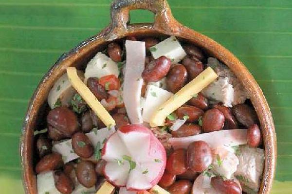 Para el aliño, vierta los quesos en un recipiente; agregue el chile pimiento, las rodajas de butifarra, la pimienta, el tomillo, el laurel, el perejil, el vinagre y el aceite de oliva. Revuelva todo, sazónelo al gusto y viértaselo a la piloyada.
