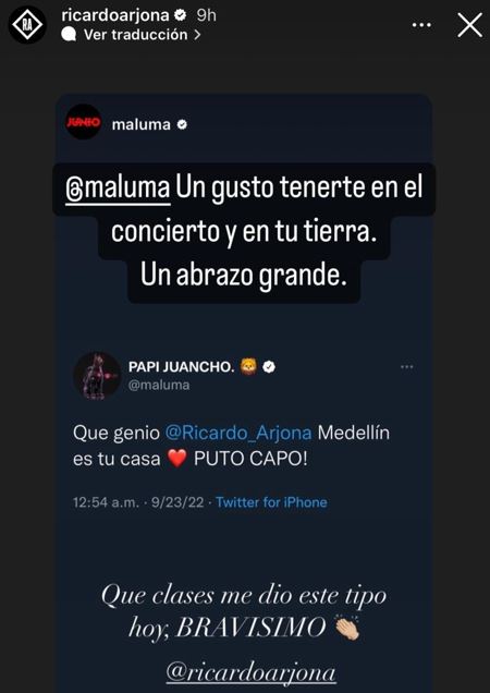 “Maluma, un gusto tenerte en el concierto y en tu tierra. Un abrazo grande”, respondió Ricardo.