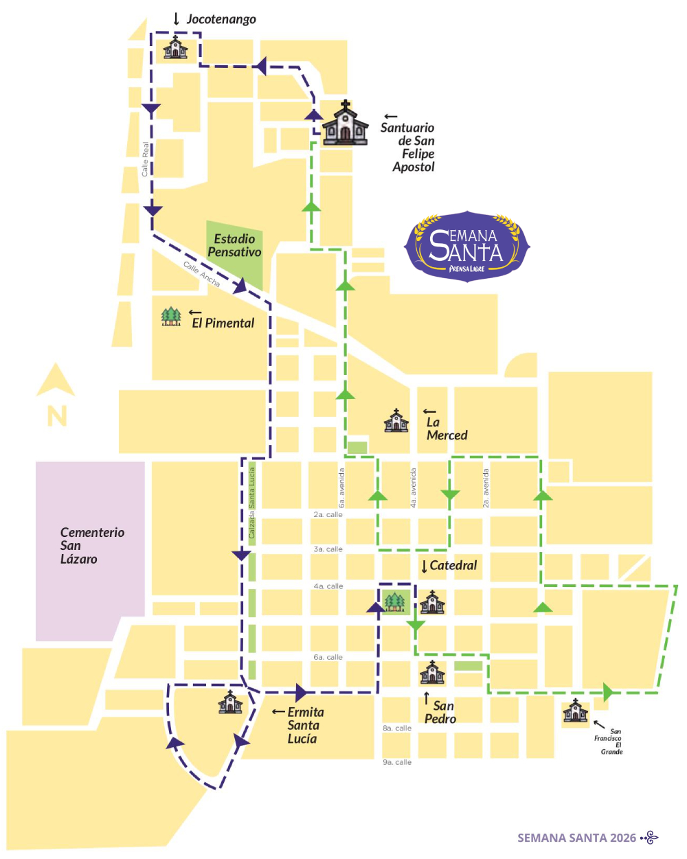 Recorrido de la procesión del Templo de San Francisco El Grande, Santuario del Santo Hermano Pedro(Imagen: diseño Prensa Libre)