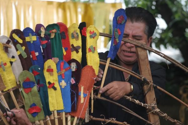 Unos 40 hombres, dirigidos por ancianos conocedores de la tradición y auxiliados por niños y jóvenes, participaron durante estos dos días, primero en armar y sujetar 12 estructuras de reglas de madera de cedro o pino y delgados bejucos traídos de las montañas cercanas, y después con la colocación en las estructuras de madera, una a una, de piezas de tela de 30 centímetros de largo sostenidas por varas de caña de Castilla, redondeadas en la punta, que sustituyen a las plumas de guacamaya, quetzal y otras aves con las que los antiguos mayas adornaban esos tronos móviles, en los cuales se sentaban grandes señores.