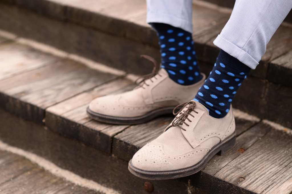 Otra regla es que, si el pantalón es liso y los zapatos son discretos, se puede utilizar calcetines con puntos y patrones de combinaciones de tres o cuatro colores.
