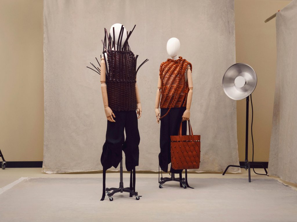 Llaman especialmente la atención dos tops realizados en cuero con técnica de cestería, un método en el que el diseñador lleva trabajando diez años, diseños para los que ha contado con la colaboración de la artesana Idoia Cuesta.