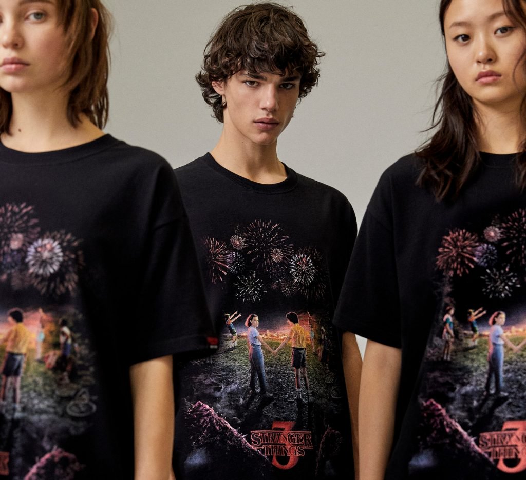 La colección también incluye una gama de sudaderas y camisetas decoradas con gráficos exclusivos del elenco y el logo “Strange-wing”, creado con motivo del estreno de Stranger Things 3.
