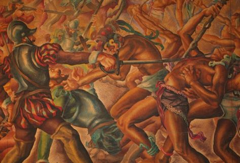 Otra de las obras que se puede apreciar es El Choque de Alfredo Gálvez Suárez, que representa el escenario de la Conquista, en 1524. Está en el Palacio Nacional de la Cultura, 6a. Av. y 6a. calle, zona 1.