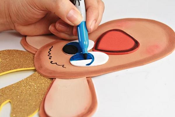 4. Pega las piezas con silicón sobre la cara del reno. Pega primero el interior de las orejas, luego los cuernos y por último, las demás partes de la cara.