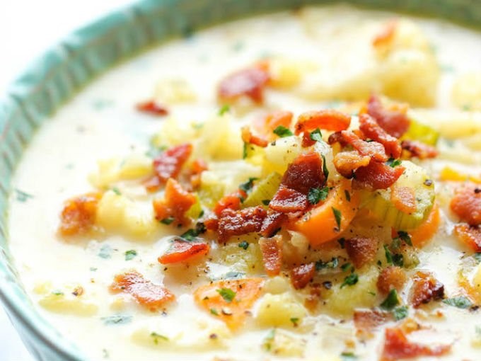 Cocinar el tocino en una sartén junto con la cebolla, la hoja de laurel, el apio y la zanahoria. Retirar del fuego hasta que estén al dente y reservar. Luego, en una olla mezclar la mantequilla con la harina. Cocinar hasta que dore a fuego bajo. Agregar el caldo de pollo y la leche y revolver hasta que espese un poco. Agregar la coliflor y cocinar durante 10 minutos.