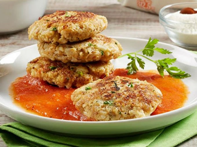 Cortar la coliflor en ramitos pequeños, luego cocinar en agua con sal, hasta que estén al dente. Retirarlos del agua con un colador. Después, picar con un cuchillo y sazonar con sal y pimienta. Mezclar la coliflor con harina, queso y miga de pan. Hacer las tortitas y reservarlas. En una sartén, cocinar las tortitas con el aceite de oliva y servir con la salsa de tomate caliente. Decorar con perejil.