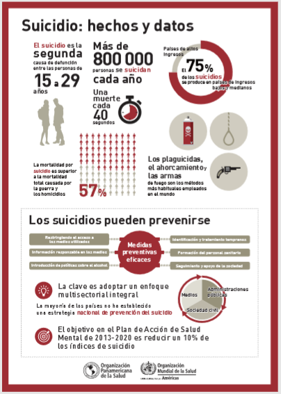 Según la OMS, el suicidio es la segunda causa de defunción entre personas de 15 a 29 años en el mundo. El 75% de estas muertes ocurren en países con ingresos bajos. Los plaguicidas, el ahorcamiento y las armas son las formas más habituales empleados por el suicida.