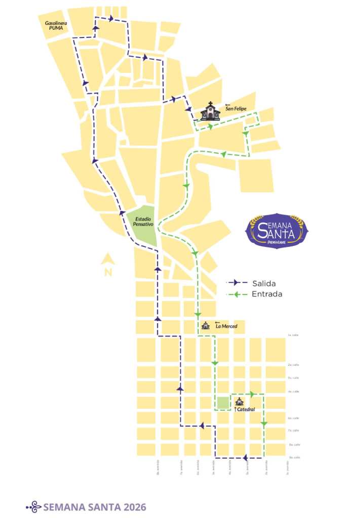 Mapa del recorrido procesional de Jesús Nazareno del Milagro, del Santuario de San Felipe Apóstol. (Diseño: Prensa Libre)