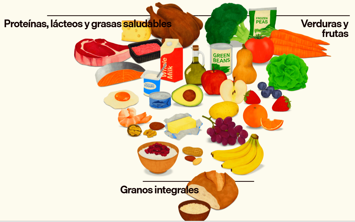MyPlate, por ejemplo, divide un plato en cinco grupos: la mitad con frutas y verduras, y la otra mitad entre granos (preferiblemente integrales) y proteínas, acompañado de un lácteo.