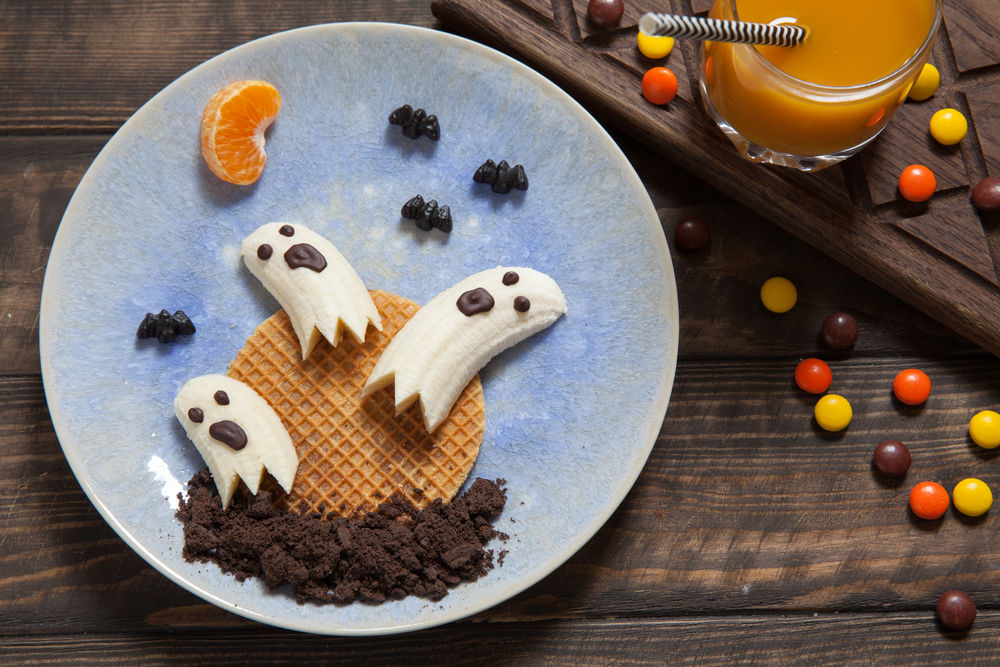 En una fiesta no puede faltar la comida y esta debe ir con el tema de fantasmas, arañas y calabazas. Para los niños resultará sumamente atractivo al momento de comer, pero, sobre todo, gozarán de un momento divertido y lleno de creatividad en familia si usted desea realizar recetas en casa. Basta con un poco de imaginación para poder convertir un banano y unas chispas de chocolate en un fantasma en el plato.
