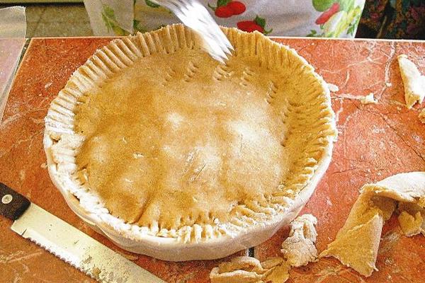 Engrasar y enharinar un molde para pastel. Agregar la mitad de la mezcla de la torta. Luego, colocar sobre este el relleno de manzana ya frío. Distribuir bien. Colocar la otra mitad de la mezcla, cubriendo todo el relleno.