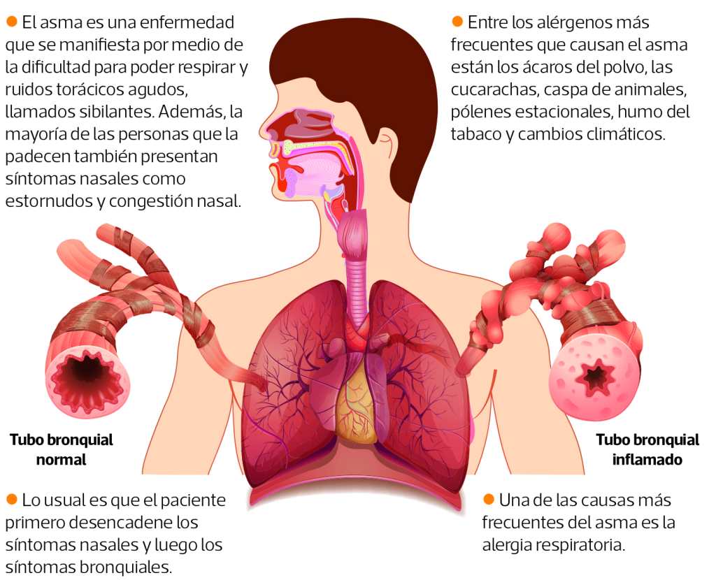 - Alergias en vías respiratorias. Son las alergias más comunes en el país, propensas en la niñez y adultez. En este grupo se encuentra la rinitis, conjuntivitis y asma bronquial. Se caracterizan por presencia de síntomas como la congestión nasal y picazón. La rinitis es la inflamación de la mucosa nasal, provocada generalmente por el polen. Presenta estornudos, irritación en los ojos y garganta, congestión nasal y abundante secreción de moco. Por su parte, el asma bronquial se caracteriza por la inflamación crónica de los bronquios, que causa la sensación de falta de aire, pitidos y sensación de opresión en el pecho. La conjuntivitis es la inflamación crónica de las capas de los ojos, causada por un alérgeno que ingresó por la respiración o por alimentos. Se manifiesta por medio del enrojecimiento de los ojos, lagrimeo y picazón.