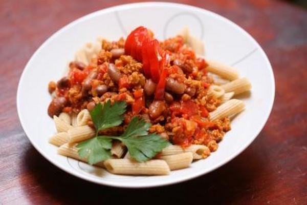 Agregar la soya texturizada y una lata de frijoles enteros rojos a la salsa. Colocar sobre una cama de fideos pluma integrales.