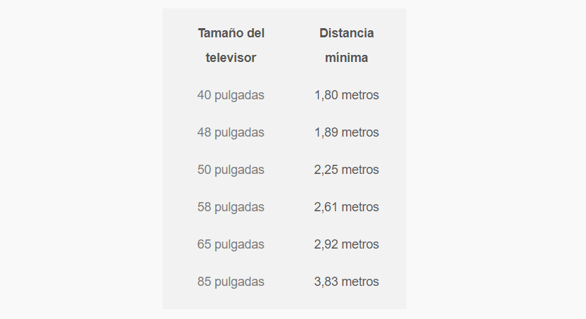 - El tamaño. Es equivocado pensar que una pantalla más grande ofrece mejor calidad y resolución. Su visibilidad se verá beneficiada según la distancia en la que usted esté de la pantalla. Considere esta tabla para saber dónde colocar el sillón es lo siguiente (tómelo en cuenta por el tamaño de su sala).