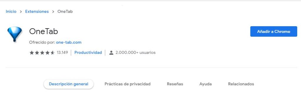 La función de OneTab es convertir esas pestañas sin usar en un listado de enlaces que podrá restaurar en cualquier momento, ya sea de forma grupal o individual. También permite crear listas de enlaces, compartirlas en forma de página web o guardarlas para verlas después.