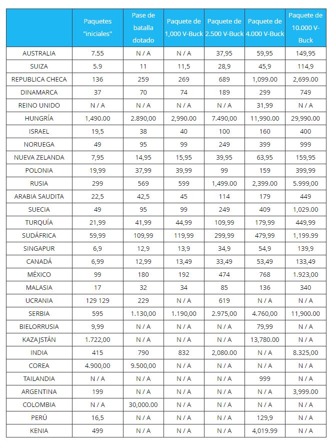 De acuerdo con una publicación de Epic Games es su web oficial, se indicó que el precio de Fortnite para los productos tuvo variación entre las regiones y plataformas.