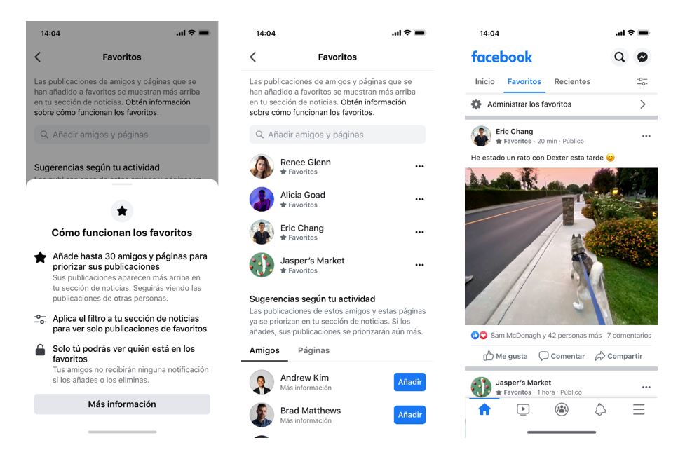 En cambio, si el usuario elige la opción “Favoritos”, solo le aparecerán los mensajes de amistades y páginas que la red social considere más “importantes” para él, y este podrá añadir y eliminar manualmente todas las que quiera, de manera que pasará a poder decidir qué es lo que quiere ver y qué es lo que no quiere ver.