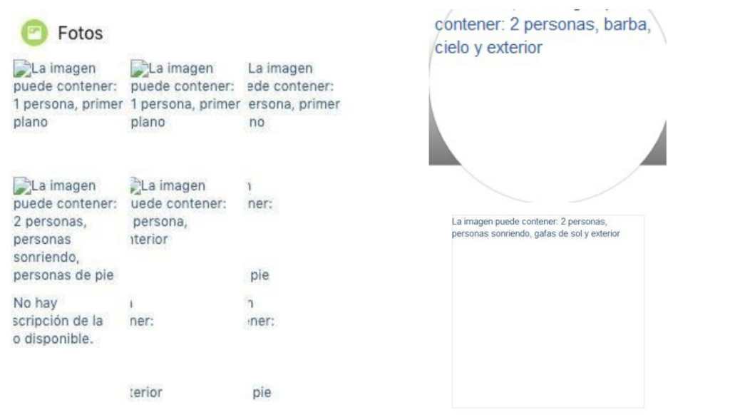 “La imagen puede contener: 1 persona, primer plano”, “La imagen puede contener: 2 personas sonriendo, personas de pie”, “La imagen puede contener: cielo, exterior, agua y naturaleza” y ““La imagen puede contener: un gato”, son algunos de los textos que Facebook e Instagram mostraron a falta de la visualización de las fotos en esas plataformas.
