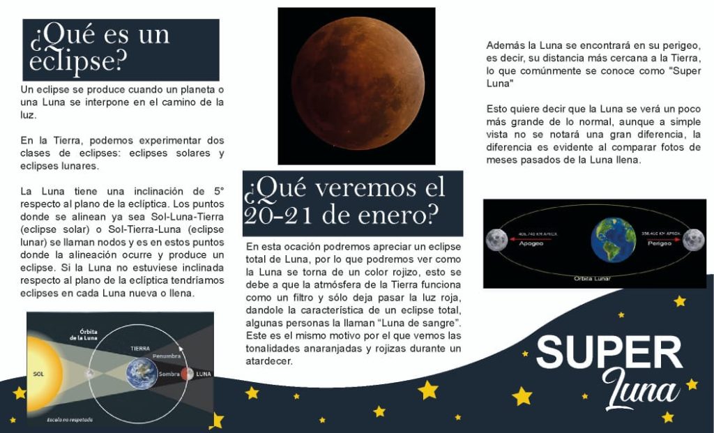 Asimismo, también ocurrirá un eclipse lunar, por lo que la Luna estará más cerca de la Tierra y se verá más grande y más brillante. Este fenómeno se conoce como Superluna.