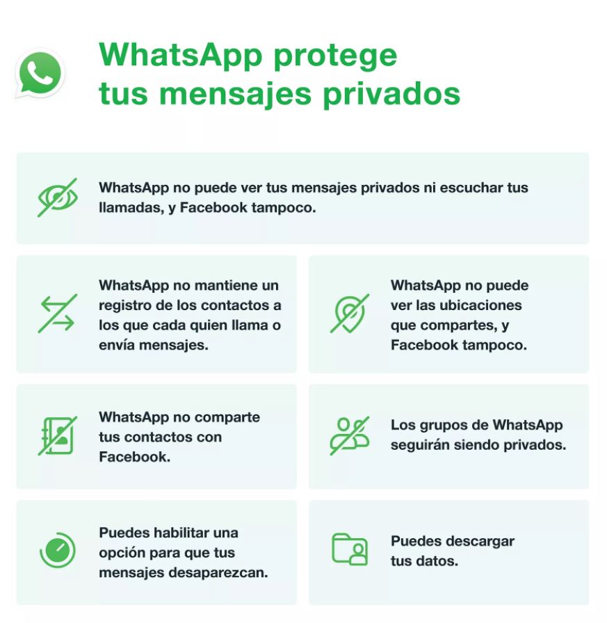 “Luego de la reciente actualización de nuestra Política de privacidad, recibimos muchas preguntas interesantes. En vista de la propagación de algunos rumores, queríamos responder algunas de las preguntas que recibimos con más frecuencia. En WhatsApp, nos esforzamos mucho para asegurarnos de que nuestra plataforma ayude a las personas a comunicarse de manera privada”, publicó recientemente la compañía en su sitio Web.