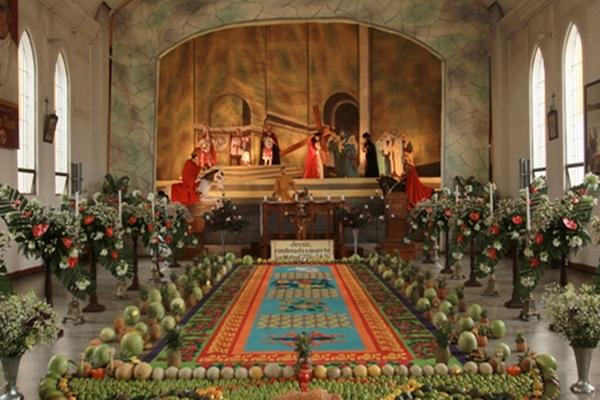 Es propio que al altar de velación antigüeño se agreguen elementos como arreglos con flores naturales, velas y el tradicional huerto, que lleva una alfombra hecha de aserrín con frutas y verduras.